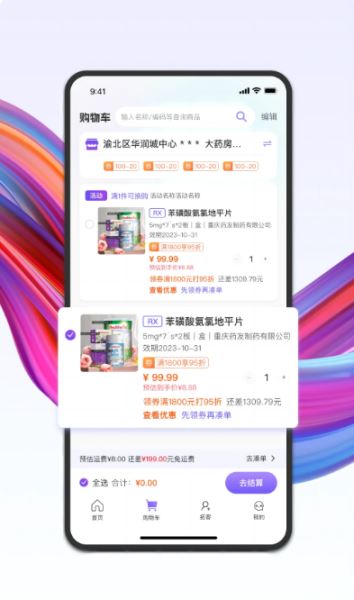 2、購物車:藥東東支持用戶將所需藥品加入到購物車中進行管理,讓用戶可統(tǒng)一下單使用。