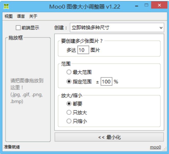 Moo0圖像大小調(diào)整器使你輕松地修改圖片大小,它非常易用,你只需把你的文件拖進(jìn)軟件界面即可,當(dāng)你在設(shè)計時經(jīng)常疑惑選擇什么大小的圖片的時候,這個軟件可能非常強(qiáng)大。。
