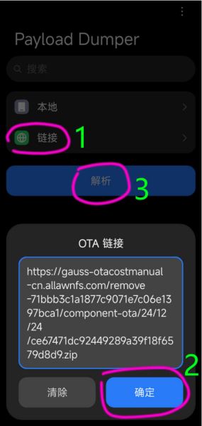 3、打開Payload Dumper:鏈接 – 粘貼 系統(tǒng)包 下載鏈接 – 解析