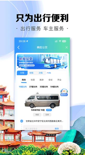 4、針對通勤、旅游等場景,提供“線上預(yù)約+拼車出行”服務(wù),支持7座/12座商務(wù)車型按需調(diào)度。