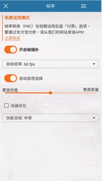幀頻轉(zhuǎn)換(又名 FRC 又名 HFR 又名 MEMC)是短期試用后的付費(fèi)選項(xiàng)。