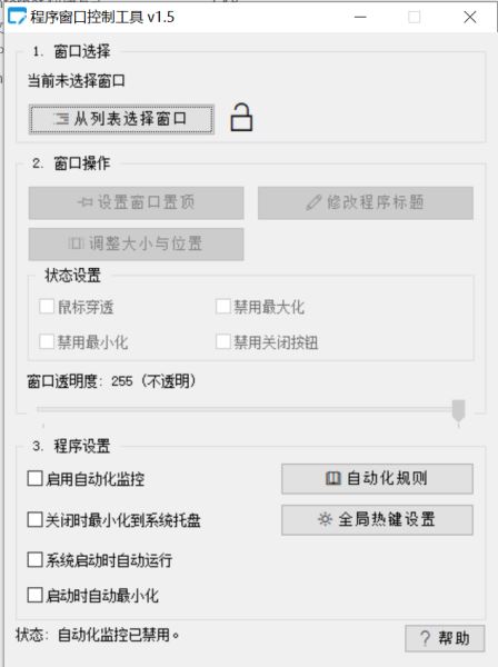 信息同步: 一旦選擇了窗口,主界面會立刻顯示該窗口的原始標(biāo)題,并解鎖所有手動操作控件。程序會同步獲取窗口的當(dāng)前狀態(tài),例如是否已置頂、按鈕是否被禁用等,并在界面上正確顯示。