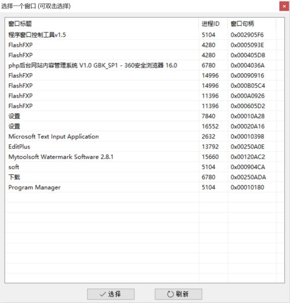 從列表選擇: 通過點擊主界面的“從列表選擇窗口”按鈕,會彈出一個包含所有可見窗口的列表。用戶可以從中選擇一個目標(biāo)窗口進(jìn)行操作。列表支持雙擊快速選擇和刷新功能。