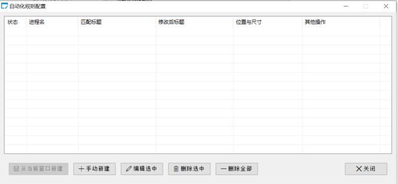 程序窗口控制工具 是一款應(yīng)用程序窗口控制管理的工具,可對單個窗口進(jìn)行實時的手動操作(如置頂、修改標(biāo)題、調(diào)整透明度等),同時內(nèi)置自動化規(guī)則,可以對更多程序窗口實時監(jiān)控并應(yīng)用規(guī)則,根據(jù)預(yù)設(shè)條件(如進(jìn)程名、窗口標(biāo)題)對其應(yīng)用一系列自定義操作。