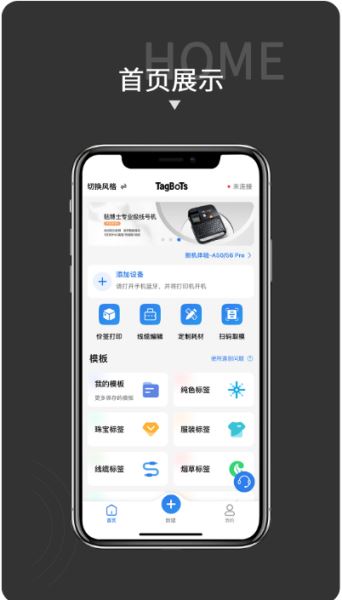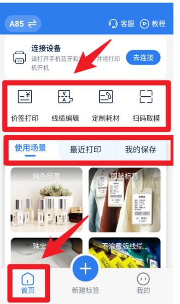 1、點(diǎn)擊底部“首頁”按鈕后,可選擇“價簽打印”“線纜編輯”等功能進(jìn)行操作,下方還可瀏覽“純色標(biāo)簽”“服裝標(biāo)簽”等使用場景模板。