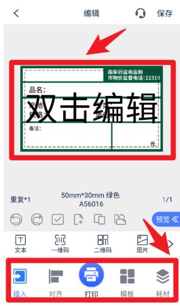 2、編輯模板時可雙擊內(nèi)容區(qū)域進(jìn)入編輯模式,自由修改品名、價格等信息,下方工具欄可插入文字、二維碼、圖片等元素,并支持打印、套用模板和選擇耗材,幫助用戶高效完成標(biāo)簽設(shè)計(jì)。