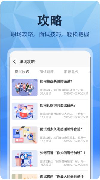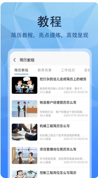 簡(jiǎn)歷網(wǎng)APP內(nèi)置涵蓋簡(jiǎn)歷撰寫技巧、面試應(yīng)對(duì)策略、職場(chǎng)禮儀規(guī)范等內(nèi)容的求職知識(shí)庫(kù)。內(nèi)容由職業(yè)規(guī)劃專家團(tuán)隊(duì)定期更新,包含200+篇結(jié)構(gòu)化教程文章與50+個(gè)視頻課程。用戶可通過關(guān)鍵詞檢索快速定位所需知識(shí)模塊。