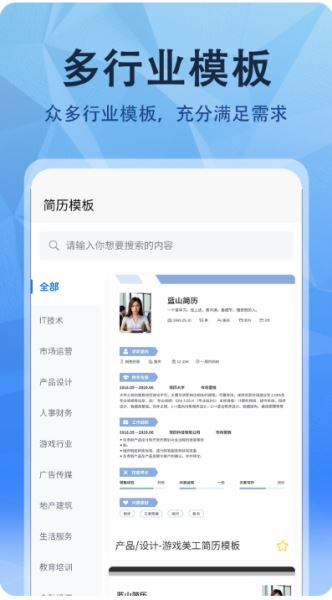APP擁有覆蓋各行各業(yè)的簡(jiǎn)歷模板資源,模板風(fēng)格涵蓋簡(jiǎn)約商務(wù)、創(chuàng)意設(shè)計(jì)、經(jīng)典傳統(tǒng)等多種類型。模板庫(kù)按行業(yè)分類,用戶可根據(jù)目標(biāo)崗位快速篩選適配模板。