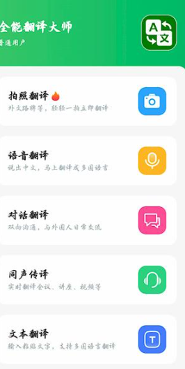 全能翻譯大師app是一款多功能翻譯應(yīng)用,提供照、語(yǔ)音、文本等多種翻譯方式,支持同聲傳譯,響應(yīng)迅速結(jié)果精準(zhǔn),很適合面對(duì)面交流使用,支持100多種語(yǔ)言,涵蓋全球大部分國(guó)家和地區(qū),輕松應(yīng)對(duì)出國(guó)旅游、商務(wù)洽談和日常學(xué)習(xí)等場(chǎng)景,擁有簡(jiǎn)潔明了的界面和便捷的操作方式。