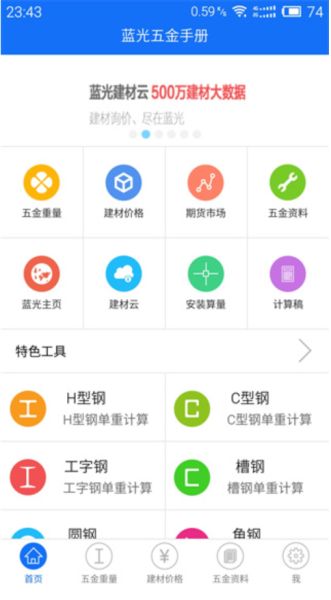 1、首頁(yè)包含重量、建材價(jià)格、五金資料、期貨市場(chǎng)等功能;