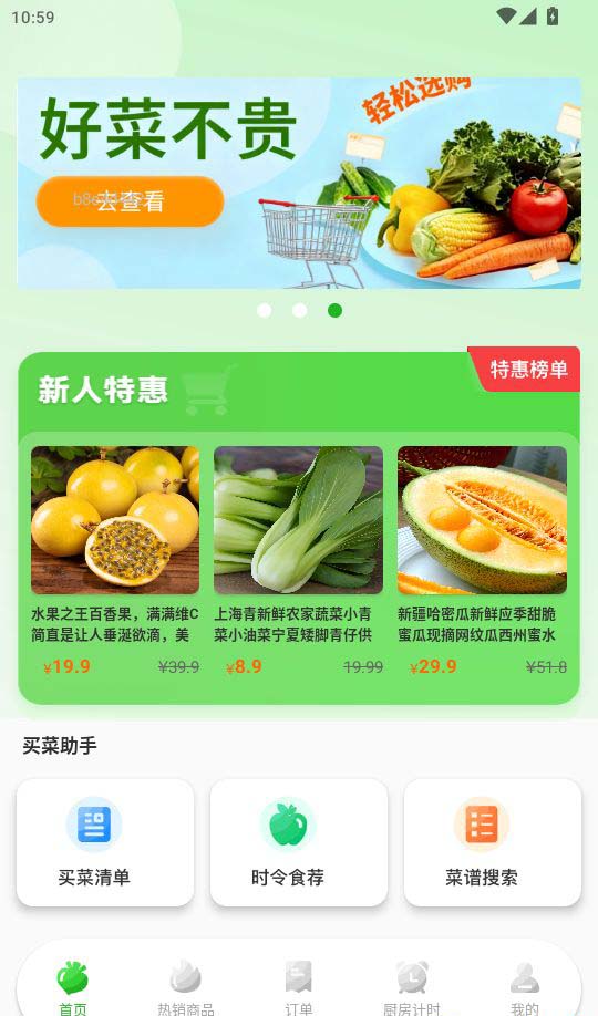 生鮮買菜特惠買app官方版是一款集多功能于一體的買菜軟件,軟件中推出了很多的熱銷商品資源,超多新鮮的時令蔬菜用戶可以任意選購,讓用戶在這里購買各種生鮮蔬菜非常的便捷省時,節(jié)省用戶線下買菜的時間成本,將用戶購買的各種時令蔬菜新鮮送到家,還提供有買菜清單、時令食薦、菜譜搜索等諸多買菜助手工具,可通過菜譜搜索按照菜譜所需食材精準(zhǔn)買菜,為用戶的日常買菜提供諸多便利與幫助,還為新人用戶提供了很多的優(yōu)惠福利,可以讓用戶在這里更加省錢優(yōu)惠的買菜,有需要的用戶就快來下載生鮮買菜特惠買手機(jī)版使用吧!