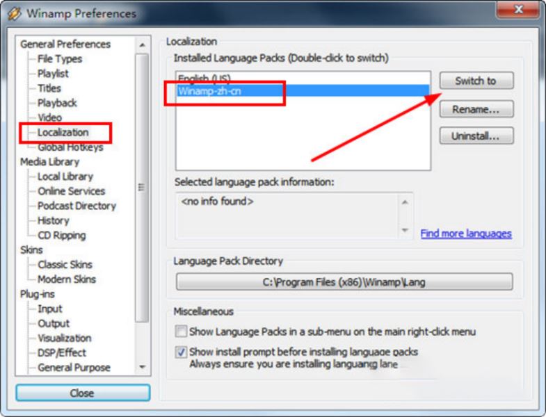 4、在左邊的欄目中點(diǎn)擊“Localization”欄,選擇紅框標(biāo)注內(nèi)的“ZH-CN”選項(xiàng),點(diǎn)擊其中的Switch to選項(xiàng)即可切換為中文,如下圖所示:
