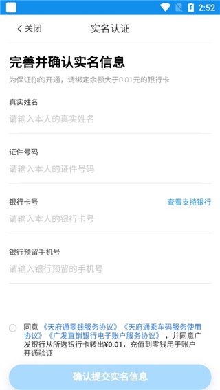 5、選擇賬戶認證,在實名認證欄中輸入您的姓名、身份證號、本人銀行卡號(非信用卡)、銀行預留手機號,即可開通乘車二維碼。