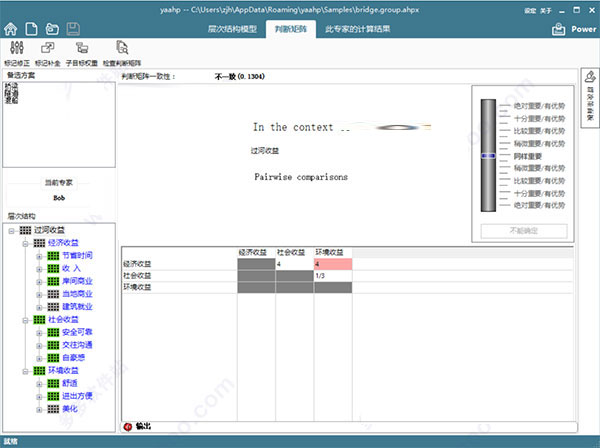 ②使用yaahp,在輸入判斷矩陣數(shù)據(jù)時(shí),軟件能根據(jù)數(shù)據(jù)變化實(shí)時(shí)顯示判斷矩陣的一致性比例,而且對(duì)于不一致的判斷矩陣,yaahp還可以實(shí)時(shí)地顯示當(dāng)前對(duì)一致性影響最大的元素,方便用戶掌握情況做出調(diào)整。