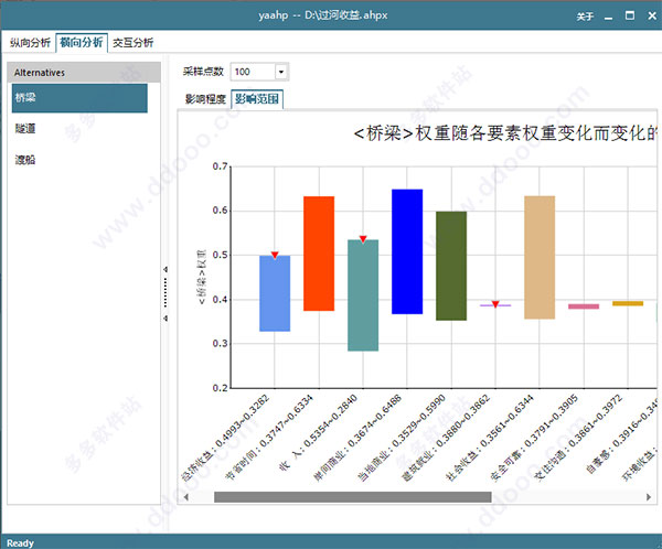 ②利用yaahp提供的靈敏度分析功能,能夠查看備選方案權(quán)重隨不同要素變化而變化的情況、備選方案權(quán)重排序改變情況等,還可以動(dòng)態(tài)地觀察要素權(quán)重變化對(duì)備選方案權(quán)重的影響,并且能夠生成靈敏度分析報(bào)告。