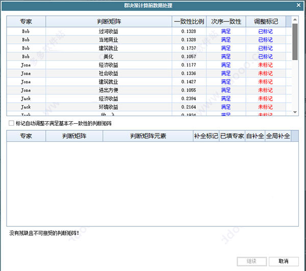 群決策計(jì)算前,需要對(duì)不滿足一致性或殘缺的判斷矩陣(群決策的專家數(shù)據(jù)經(jīng)常出現(xiàn)這種情況)進(jìn)行處理,此功能能夠進(jìn)行統(tǒng)計(jì)并一步設(shè)定處理方式。
