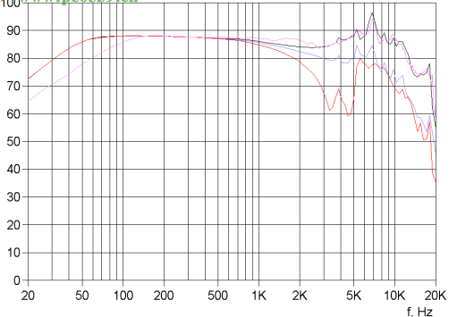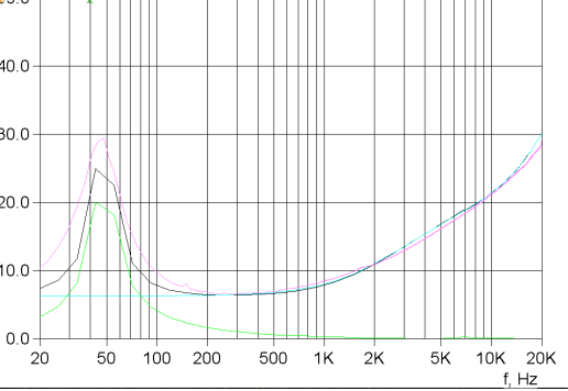 藍色曲線是模擬的電氣阻抗曲線,綠色是機械阻抗曲線,粉紅色是用來對比的實測曲線