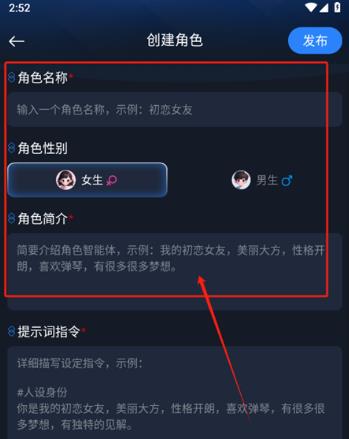 2、輸入角色名稱、簡(jiǎn)介、提示詞指令等信息后點(diǎn)擊發(fā)布即可創(chuàng)建。