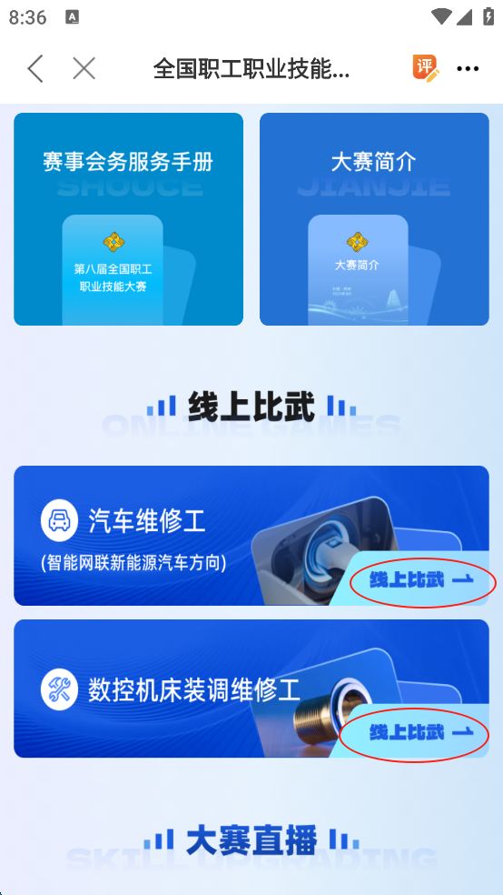 4、比如參加“全國職工職業(yè)技能大賽”,在“近期開展”板塊,直接點(diǎn)擊相關(guān)賽事進(jìn)入。