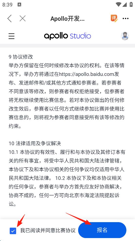 8、隨后看完比賽協(xié)議,勾選左下角的“同意協(xié)議”,最后點(diǎn)擊右下角的“報(bào)名”,這樣就完成了比賽的報(bào)名。