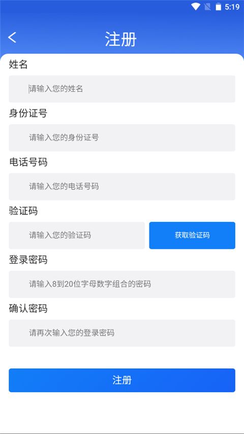 3、輸入你的姓名、身份證、電話號(hào)碼、密碼等等信息,之后點(diǎn)擊注冊(cè)即可。