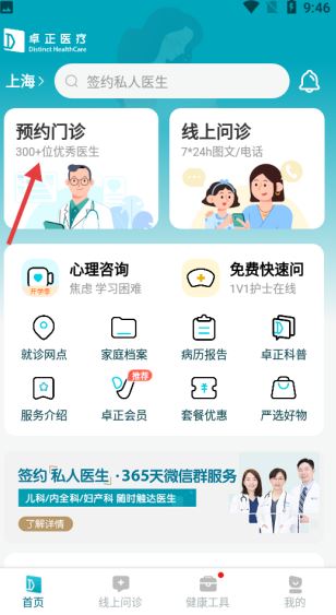 1、打開卓正醫(yī)療APP,點擊【預(yù)約門診】,進入科室及服務(wù)選擇頁。