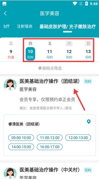 3、在醫(yī)學(xué)美容頁,選預(yù)約日期和具體醫(yī)美服務(wù)項目。