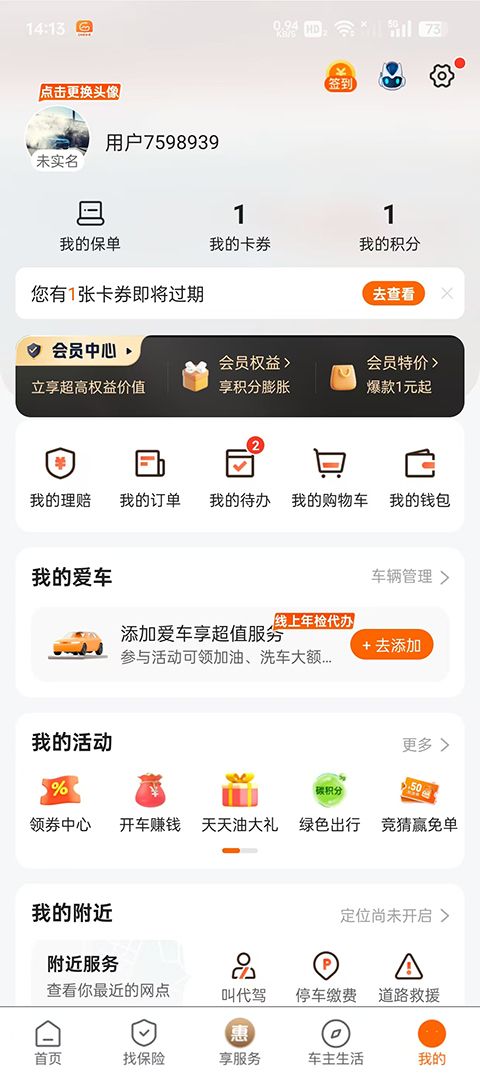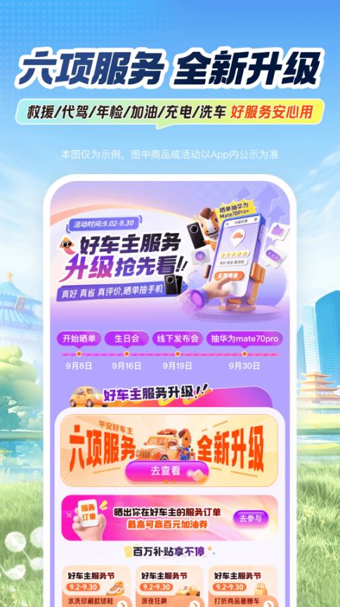 車主活動中心、新車優(yōu)惠、車圈、服務(wù)窗、購個人險、道路救援、車價評估、年審代辦等服務(wù), 更有天氣變化、洗車指數(shù)、加油88折,免費實時道路救援、平安門店、修理廠、加油站查詢等。