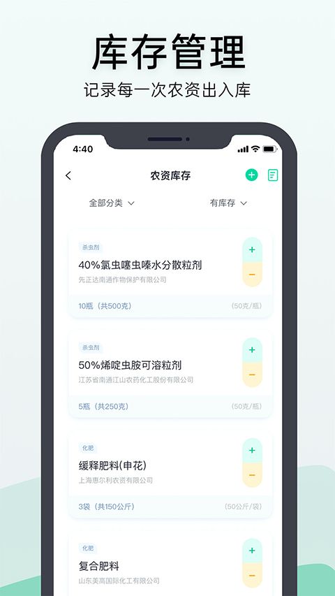 可管理肥料、農(nóng)藥、種苗的庫(kù)存,支持各類出入庫(kù)操作,可管理農(nóng)產(chǎn)品的庫(kù)存,支持采收入庫(kù)、銷售出庫(kù)、損耗出庫(kù)。