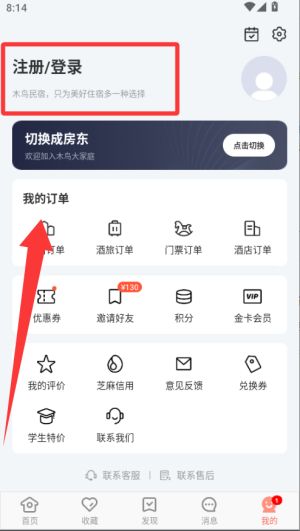 1、首先打開并使用手機號登錄木鳥民宿app后進入【我的】頁面中點擊【切換成房東】右側(cè)的【點擊切換】按鈕