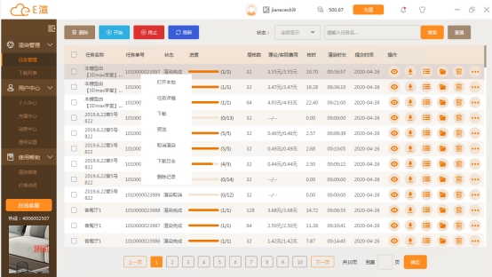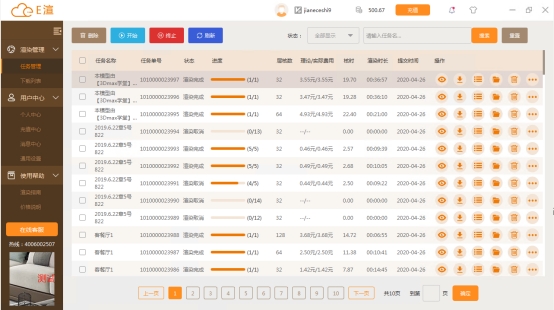 任務管理模塊主要顯示任務名稱、任務單號、狀態(tài)、進度、層核數(shù)、核時,費用、渲染時長、提交時間、以及基本操作。