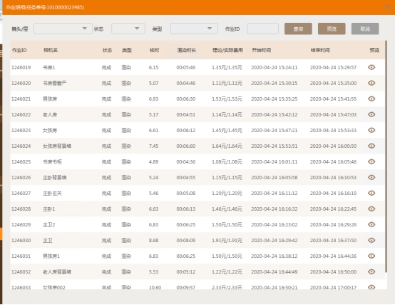 2、 作業(yè)明細:雙擊任務名稱,彈出作業(yè)明細界面,可查看該任務的所有相機詳細信息。