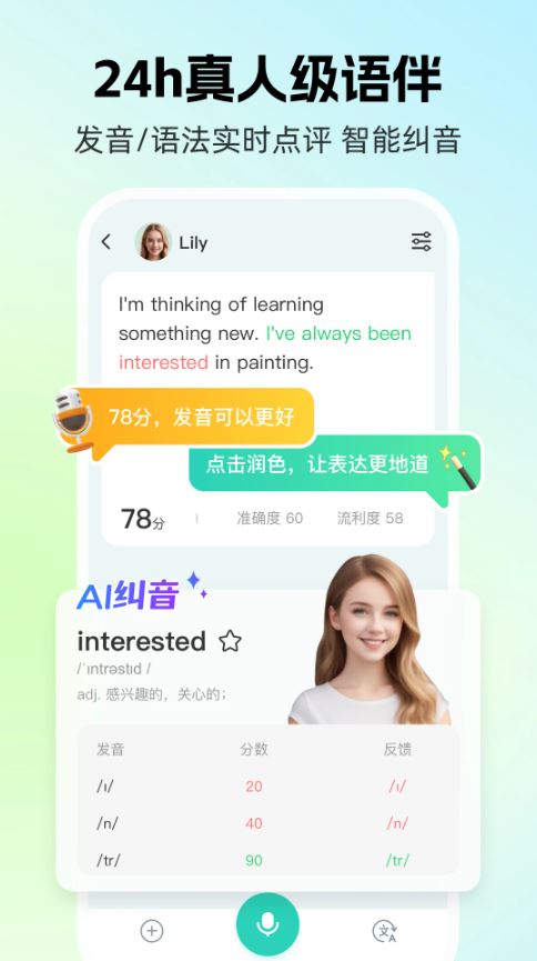 通過智能語音識別技術(shù),進(jìn)行實時的語音評測和糾錯,并針對口語進(jìn)行打分,讓你在日常生活對話和面試工作中能夠更流暢的表達(dá)自己。