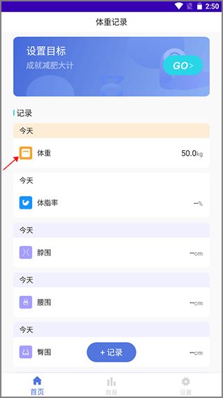 3、軟件就跳轉(zhuǎn)回到軟件的主界面,就看到自己剛剛添加的體重記錄了。