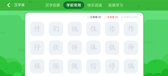1、先選擇對(duì)應(yīng)的學(xué)習(xí)階段,有漢字啟蒙、學(xué)前常用、快來(lái)閱讀三個(gè)階段可供選擇