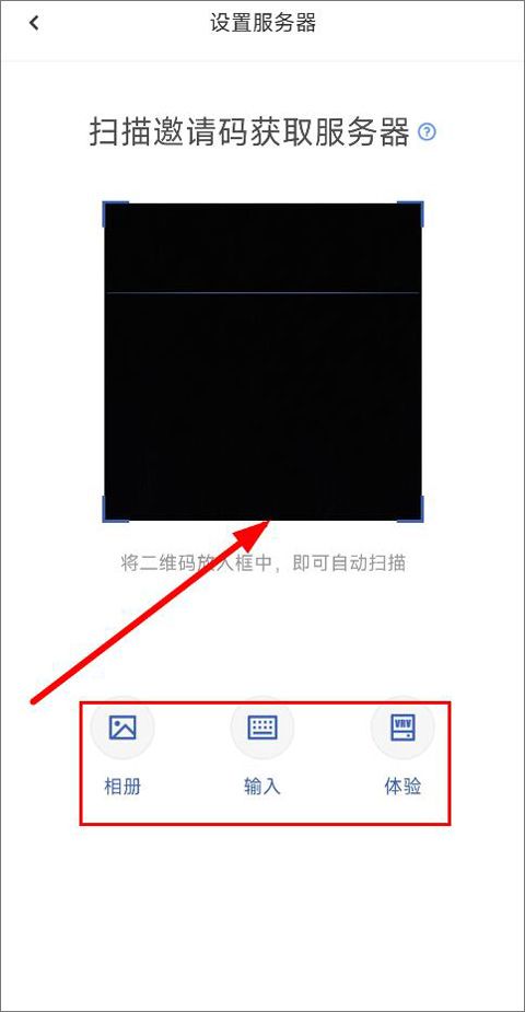 2、進(jìn)入設(shè)置服務(wù)器頁(yè)面,用戶需要掃描邀請(qǐng)碼獲取服務(wù)器,也可以選擇拍照、相冊(cè)掃描、文字輸入等方式;