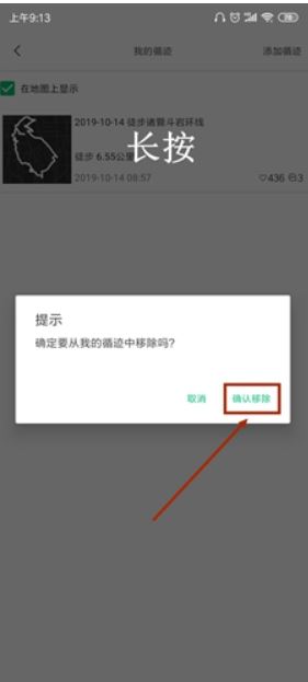 然后我們就能看到我們的一系列循跡數(shù)據(jù)了,很多用戶們還是找不到刪除的按鍵,其實只要我們長按一個我們想要刪除的循跡路線,就會出來一個詢問是否刪除的界面,點擊確認刪除即可。