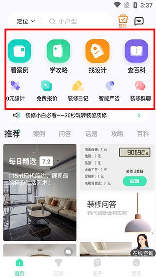 2、大家可以在首頁查看案例,也可以學(xué)習(xí)裝修攻略,或者是找設(shè)計師等。