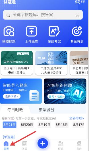 1、點擊首頁可關鍵字搜題,涵蓋拍照搜題、在線考試等功能,展示國家電網(wǎng)等多類考試題庫助力高效備考。