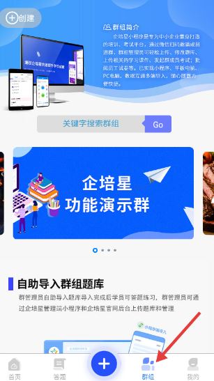 2、點擊群組界面介紹企培星小程序?qū)橹行∑髽I(yè)服務,能便捷管理學習考試,有功能演示群支持自助導入群組題庫。
