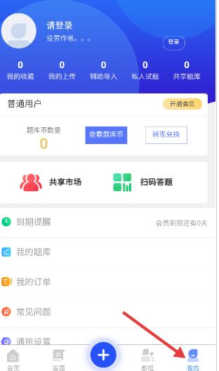 3、點擊我的頁面需登錄操作,顯示收藏、上傳等信息,提供查看題庫幣等功能還有共享市場與掃碼答題入口。