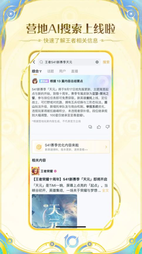 2、營地AI搜索上線啦,快速了解王者相關(guān)信息。