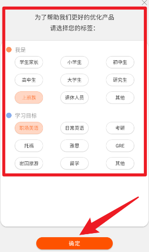 3、首次登錄后,需選擇【個(gè)人標(biāo)簽】與【學(xué)習(xí)目標(biāo)】,以便系統(tǒng)推薦合適的學(xué)習(xí)內(nèi)容。