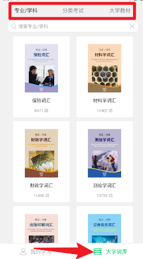 5、在【大學(xué)詞庫(kù)】中,可選擇不同學(xué)科、分類(lèi)考試或教材對(duì)應(yīng)的詞匯庫(kù),精準(zhǔn)提升專(zhuān)業(yè)詞匯量。
