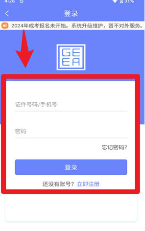 1. 打開 app后進(jìn)入登錄頁面,輸入證件號碼或手機(jī)號及密碼登錄賬號,未注冊用戶可點(diǎn)擊下方“立即注冊”。