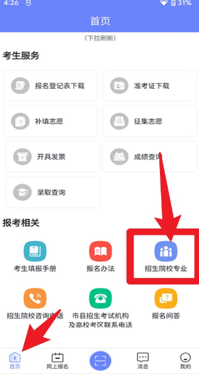 2. 登錄成功后在首頁下方導(dǎo)航欄選擇“招生院校專業(yè)”模塊,進(jìn)入后可瀏覽各高校的招生計劃與專業(yè)信息。