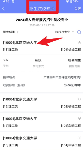 3. 在“招生院校專業(yè)”頁面中,點(diǎn)擊具體院??烧归_查看詳細(xì)的招生專業(yè)、學(xué)制、學(xué)費(fèi)及授課地址。