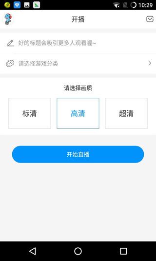 3)選擇完房間后,會進入開播設(shè)置界面,需要設(shè)置直播標題、直播分類,選擇直播清晰度,然后點擊開始直播。