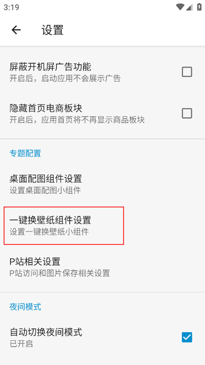 3、在設(shè)置中找到一件切換壁紙組件選項(xiàng)并點(diǎn)擊打開