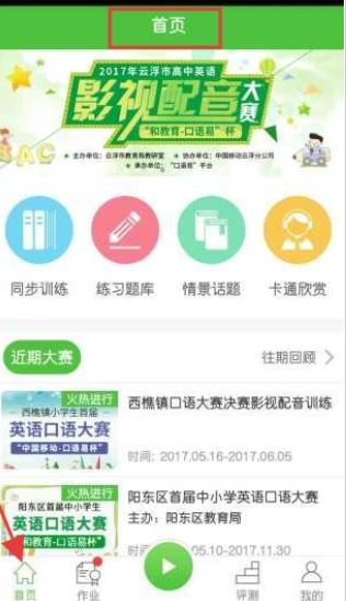 1、首頁(yè)以綠色為主色調(diào),展示2017年云浮市高中英語(yǔ)影視配音大賽等活動(dòng),還有同步訓(xùn)練、情景話題等學(xué)習(xí)板塊。
